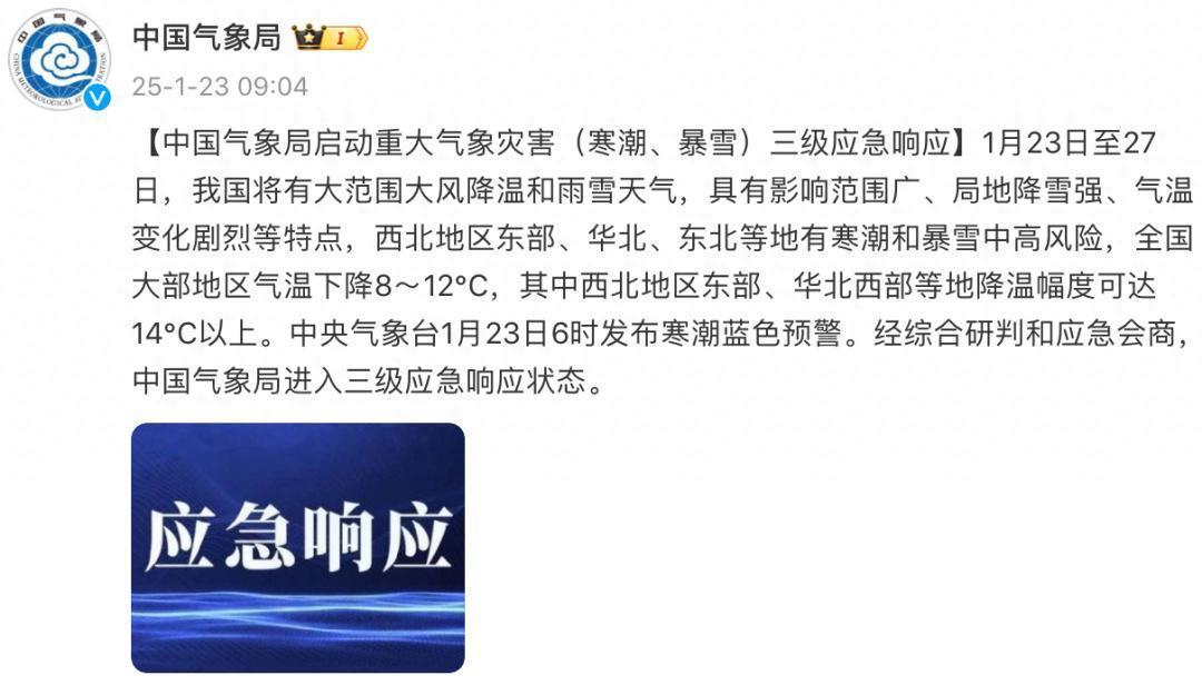 据@中国气象局 微博消息,中国气象局启动重大气象灾害(寒潮、暴雪)三级应急响应。